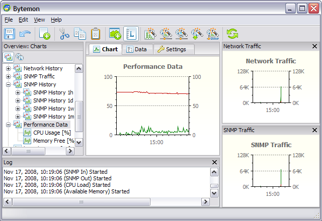 Bytemon is a network and resource performance monitoring application, intended to give administrators real-time information about the condition of networks and servers, while at the same time collecting data to provide historical data and charts for reporting, resource planning and other administrative purposes.